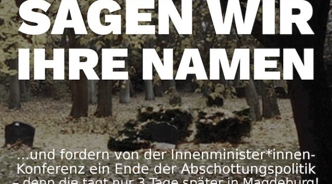 Vom 28.-30. November findet in Magdeburg die Innenministerkonferenz statt. Hier kommen die Verantwortlichen für die Grenz- und Migrationspolitik Deutschlands zusammen: Der Bundesinnenminister und seine 16 Kolleg*innen aus den Bundesländern. Mit unserem Gedenken senden wir ihnen eine Botschaft: